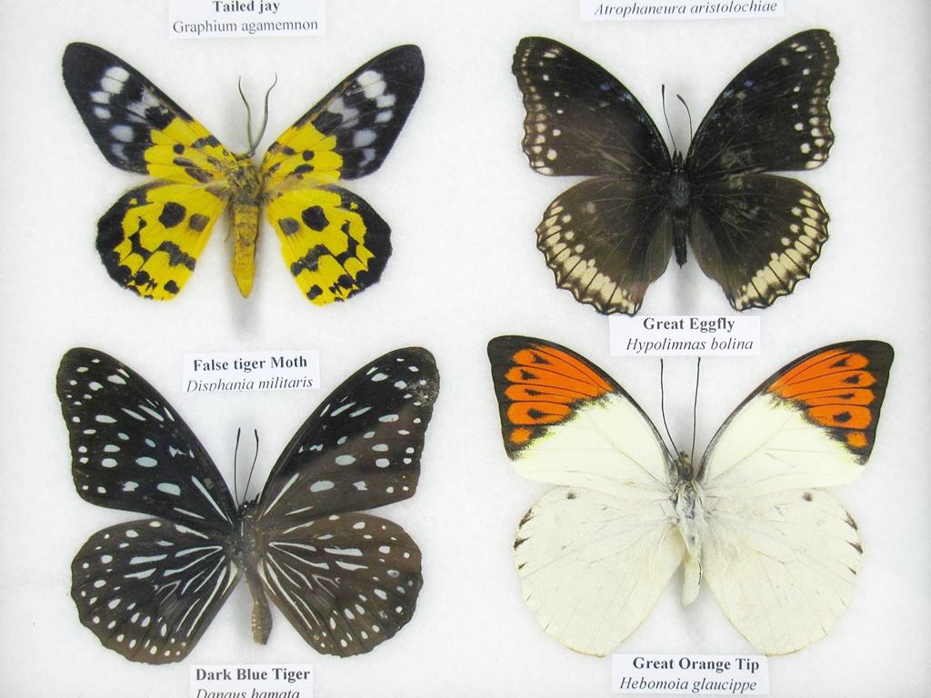 Die auf Watte fixierten Zuchtschmetterlinge werden durch eine robuste Glasscheibe auf der Vorderseite geschützt.