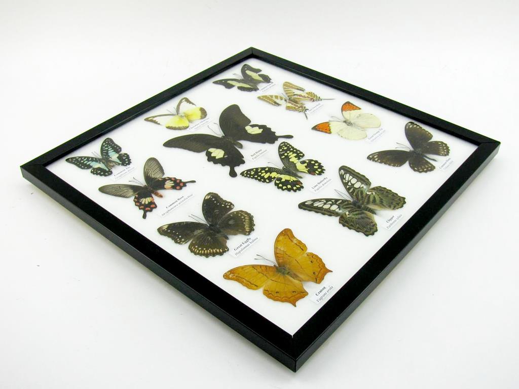 Startseite Schmetterlinge Schmetterlinge auf Watte Set mit 10 bis 15 Schmetterlingen 12 wunderschöne echte Schmetterlinge im Rahmen als Wandbild – A-12-helen-05