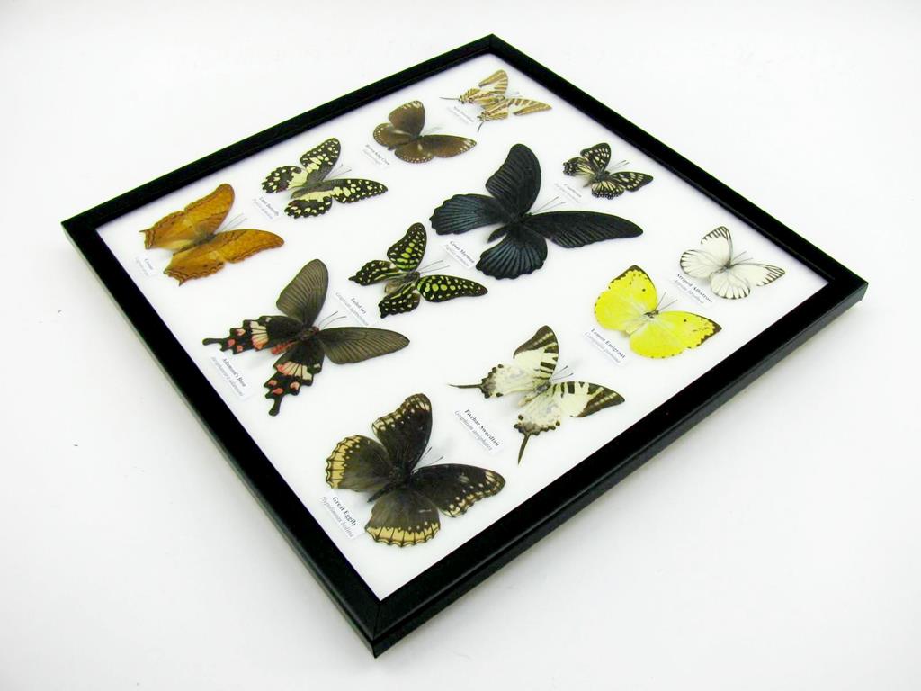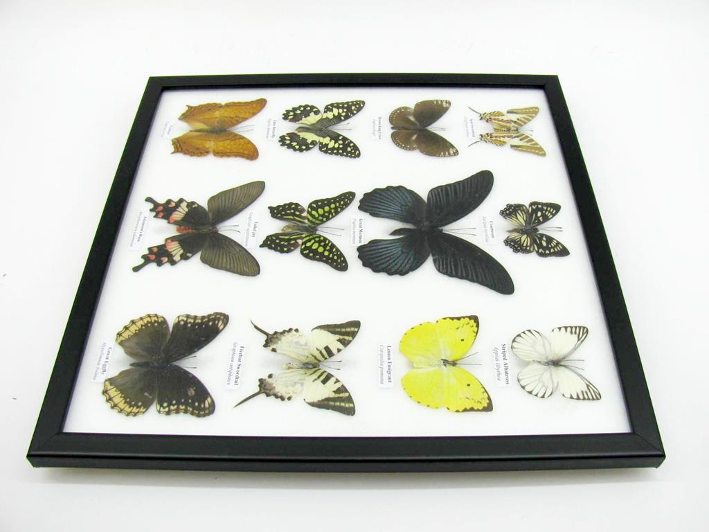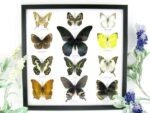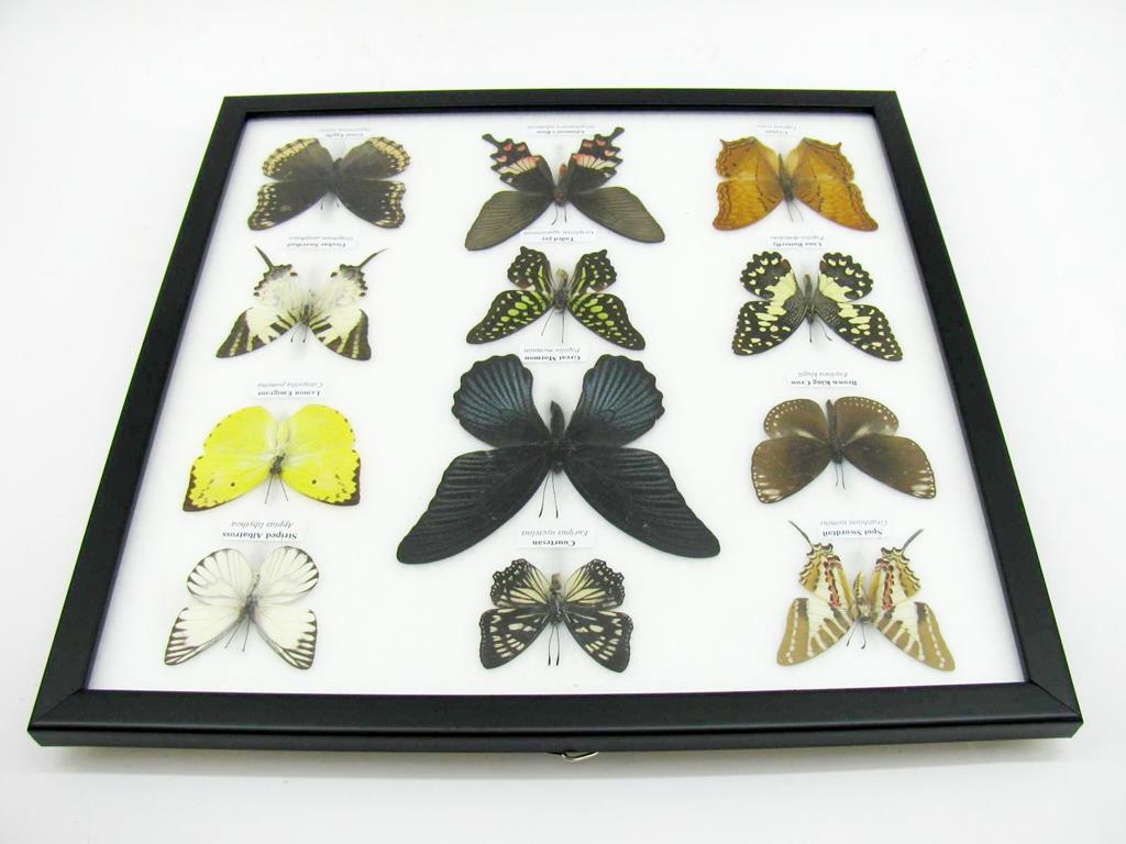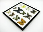 Startseite Schmetterlinge Schmetterlinge auf Watte Set mit 10 bis 15 Schmetterlingen 12 wunderschöne echte Schmetterlinge im schwarzen Rahmen als Wandbild – A-12-mor-03