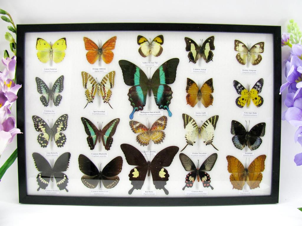20 wunderschöne echte Schmetterlinge im schwarzen Rahmen als Wandbild – A-01-blumei-13