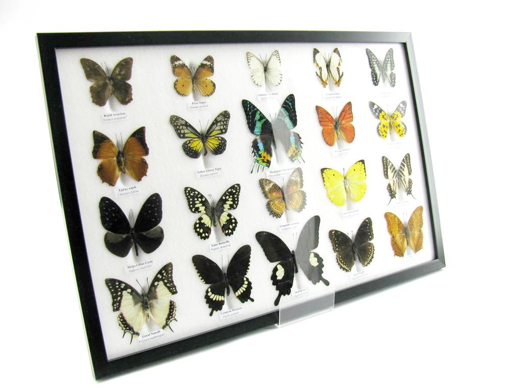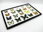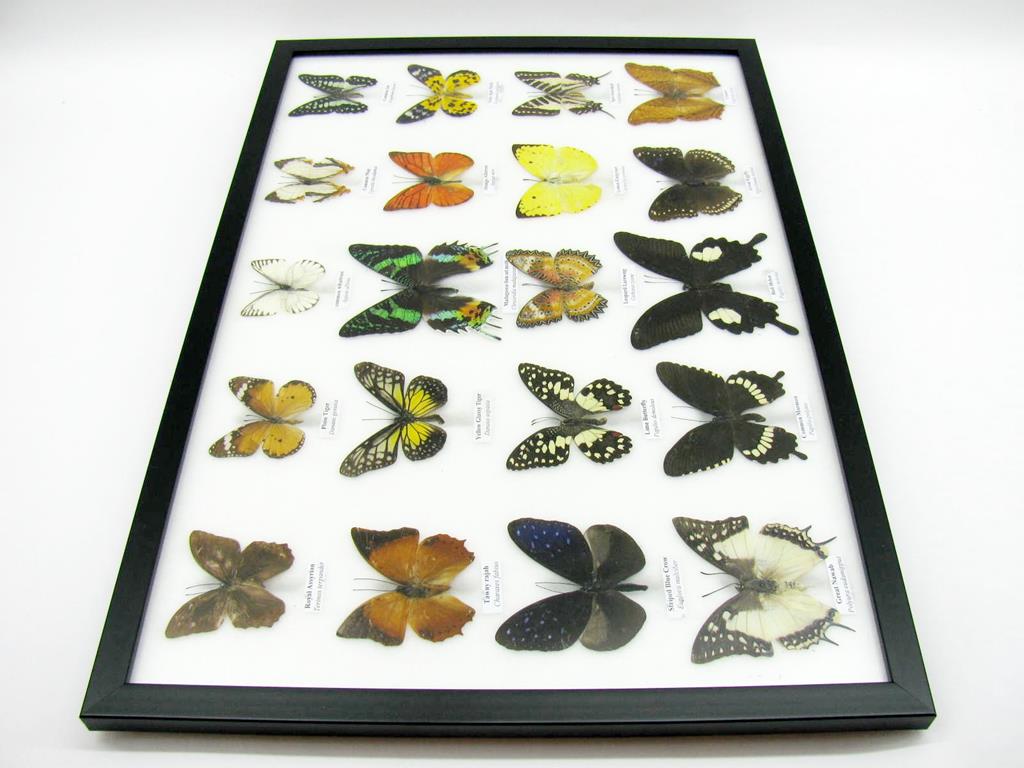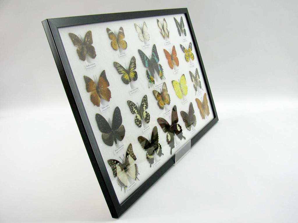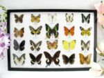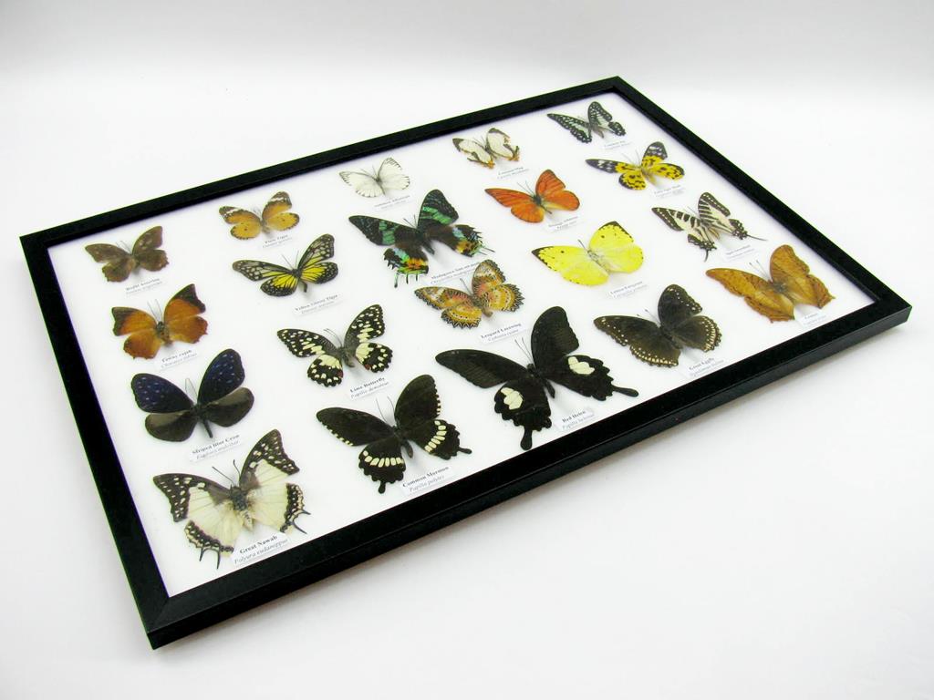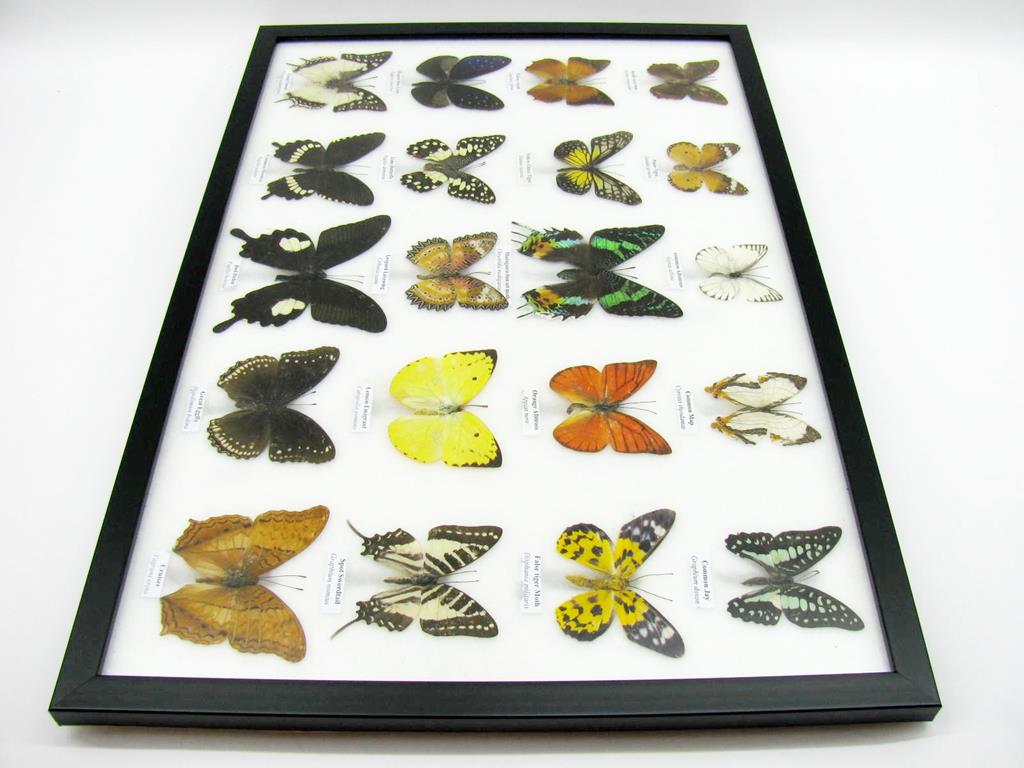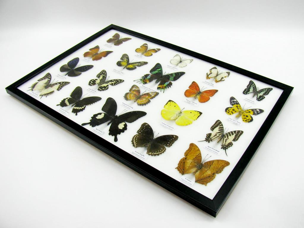 Startseite Schmetterlinge Schmetterlinge auf Watte Set mit 20 Schmetterlingen 20 wunderschöne echte Schmetterlinge im schwarzen Rahmen als Wandbild – A-20-madam-03