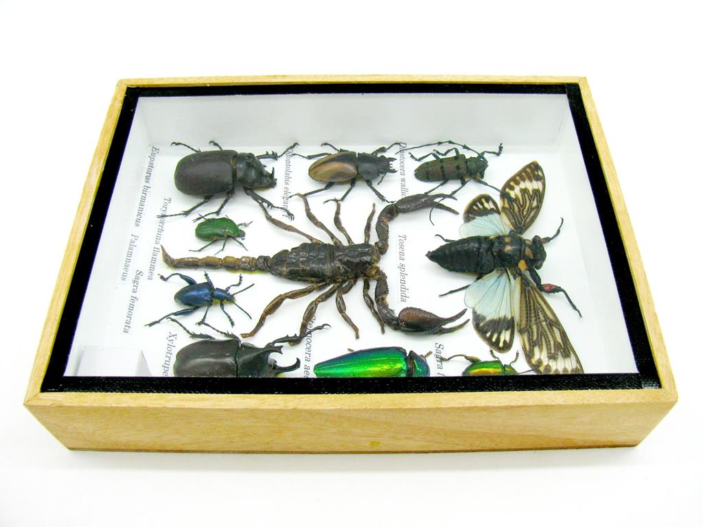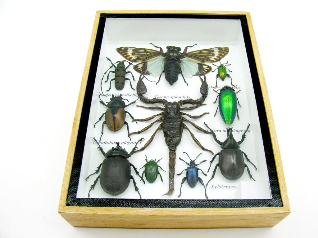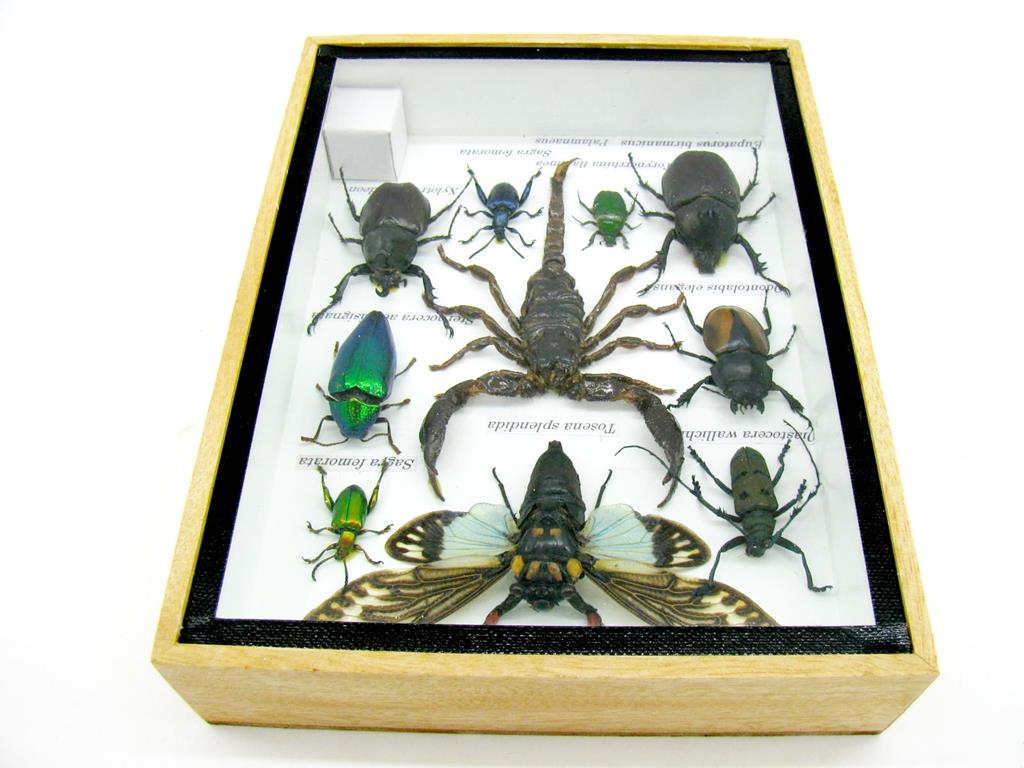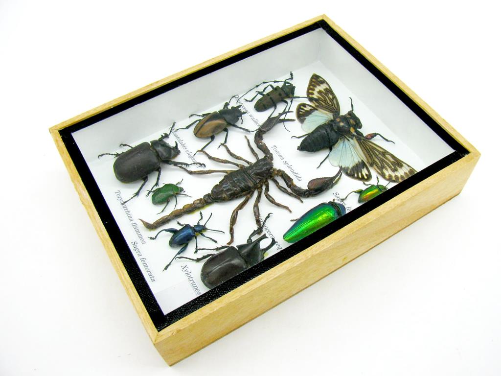 Echte exotische Insekten im Schaukasten aus Holz und Glas m-10